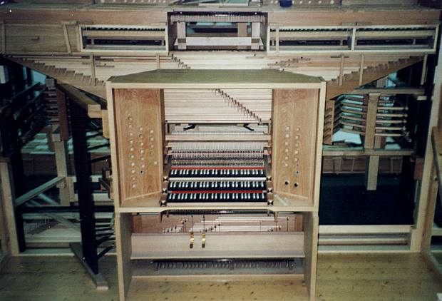 Blick auf den Spieltisch mit 2 Manualen und mittig liegendem Koppelmanual.Darüber sind die Windladen des Hauptwerkes mit darunter befindlichem Wellenbrett zu sehen.